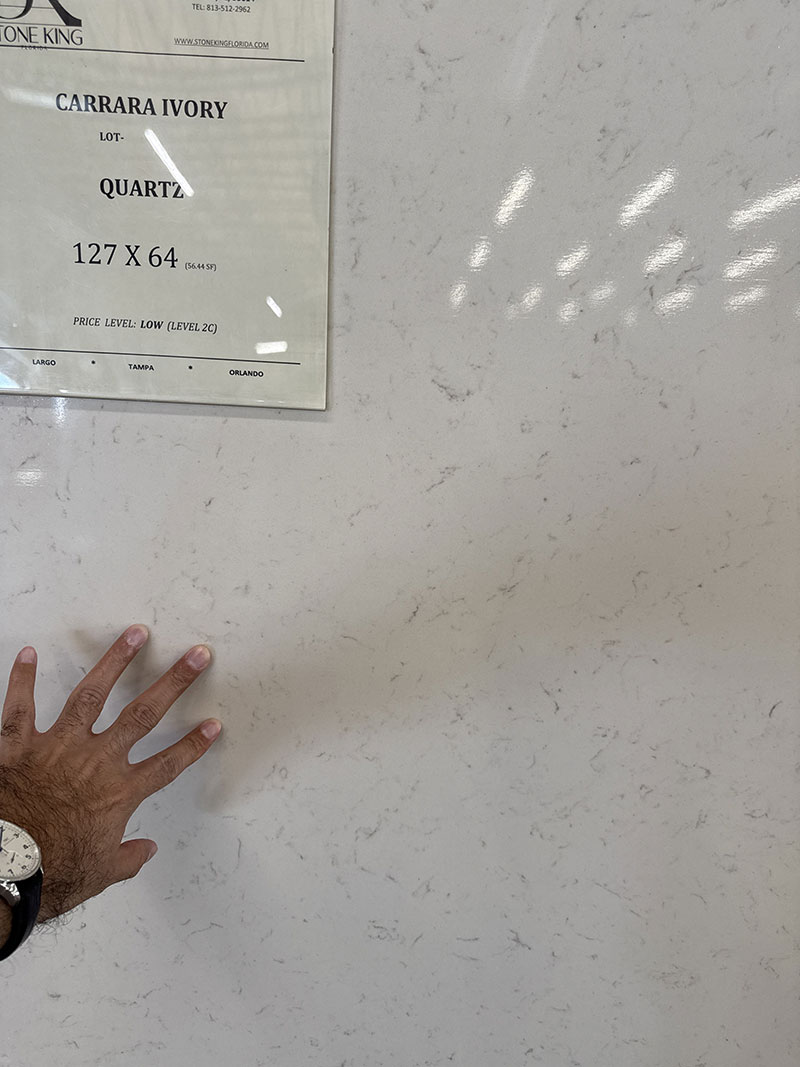 Engineered stone is a composite material made of crushed stone bound together by an adhesive, (most commonly polymer resin, with some newer versions using cement mix). The two common stones used in producing these products are marble and quartz. The application of these products depends on the original stone used. For engineered marbles the most common application is indoor flooring and walls, while the quartz based product is used primarily for kitchen countertops. Related materials include geopolymers and cast stone. Unlike terrazzo, the material is factory made in either blocks or slabs, cut and polished by fabricators, and assembled at the worksite source: wiki.